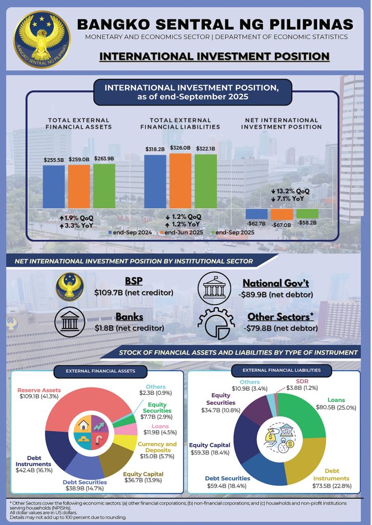 The increase was driven mainly by nonfinancial corporations and the national government. Large firms tapped more foreign loans and equity, while the government’s net debtor position widened as nonresidents and domestic financial institutions increased their holdings of government securities and foreign borrowing grew. At the same time, the BSP reduced its investments in foreign-issued debt securities, trimming part of the country’s external asset base.