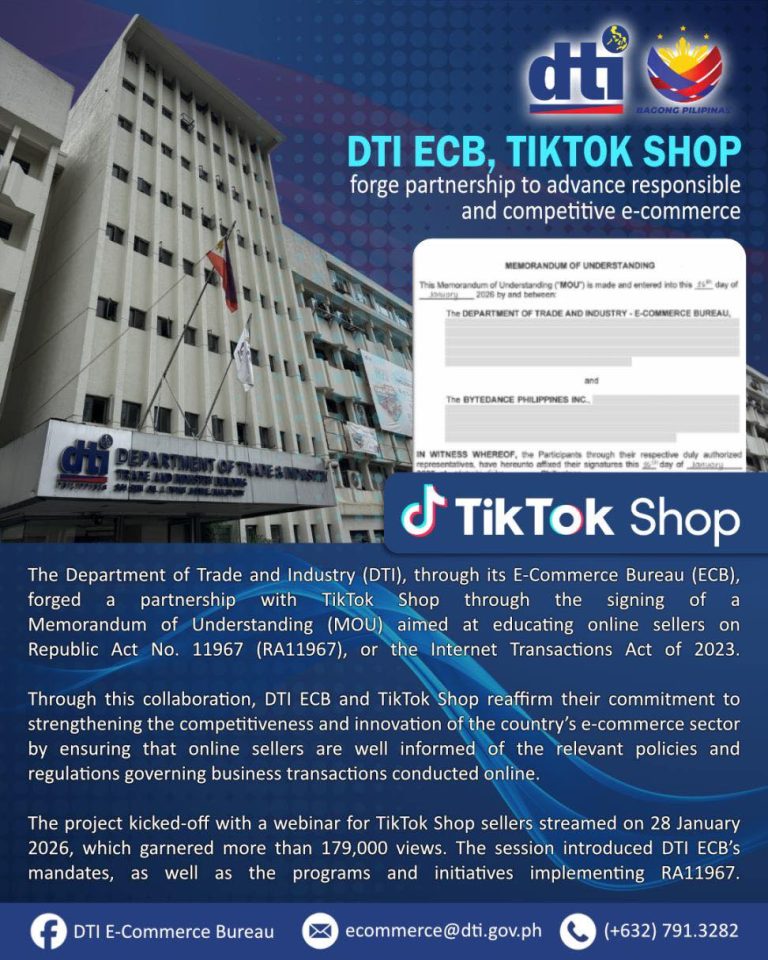 The Department of Trade and Industry (DTI) has teamed up with TikTok Shop to push responsible e-commerce practices, launching a seller education drive focused on legal compliance and consumer protection, a Department news release said recently.