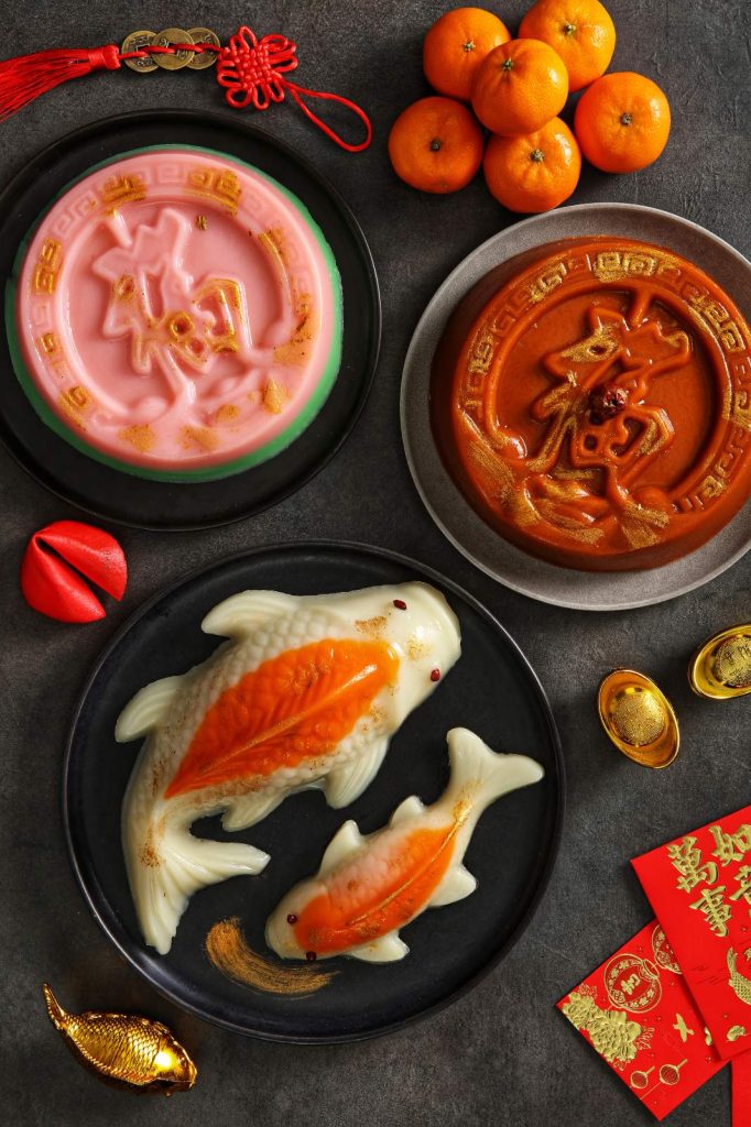 The Happiness Blessing Brown Sugar Nian Gao represents sweetness and prosperity, while the Koi Fish Nian Gao, artfully shaped to signify abundance and perseverance, completes the festive collection.