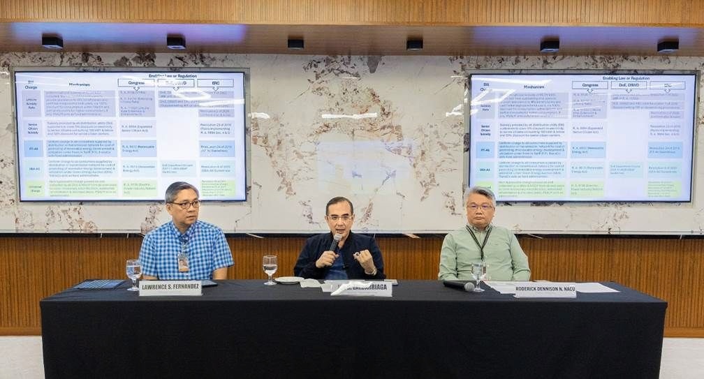 Meralco executives (from left) Head of Utility Economics Lawrence Fernandez, Head of Corporate Communications Joe Zaldarriaga, and Head of Tariff Management Roderick Dennison Nacu explain the charges reflected in electricity bills during a media briefing.